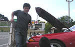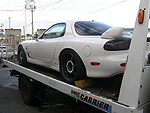 そして、更なる悪夢は帰り道で起きました。積車を運転中の店長に、トラックがお釜を掘りました!幸い、積車はなんともなかったのですが、上に乗せてある「FD3S」が、押された勢いで、キャビンにぶつかっていました!店長一言「帰ってから、スロット打ちに行く!これだけ当れば、パチスロも当るだろ!」。で、結果は、万枚出たそうです・・・。 |